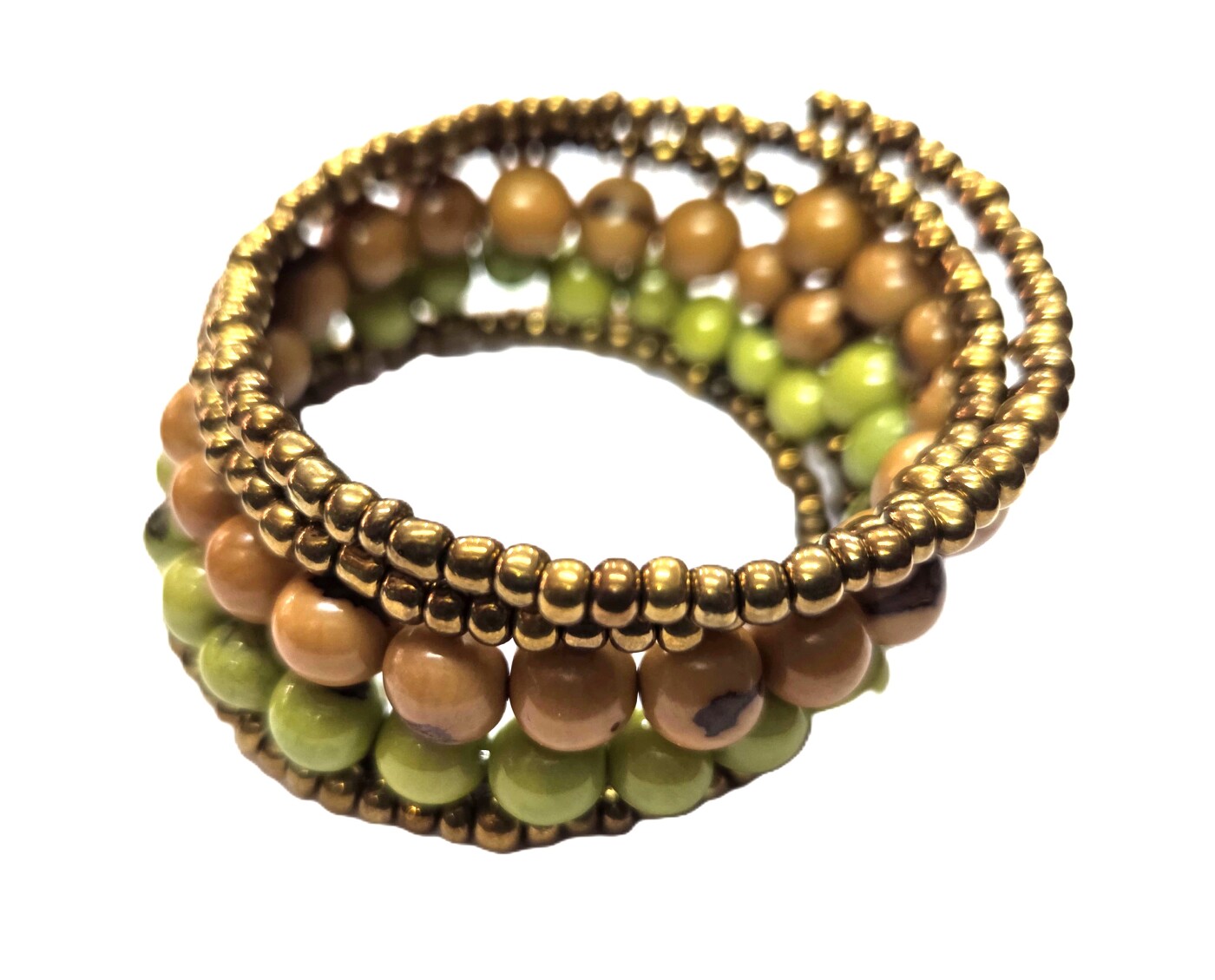 Soft Green Forest Spiral features gentle green tones paired with light brown seeds, creating a smooth and organic spiral design. Crafted by artisans in Ecuador, this bracelet offers a subtle, nature-inspired accessory perfect for modern sustainable collections.