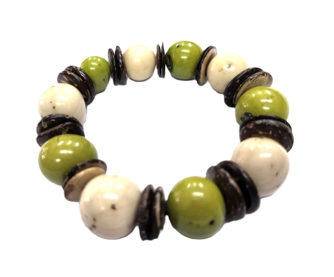Green White Contrast blends fresh green tones with crisp white tagua beads and discs, creating a striking visual balance. Handmade in Ecuador, this bracelet delivers a modern and natural style.