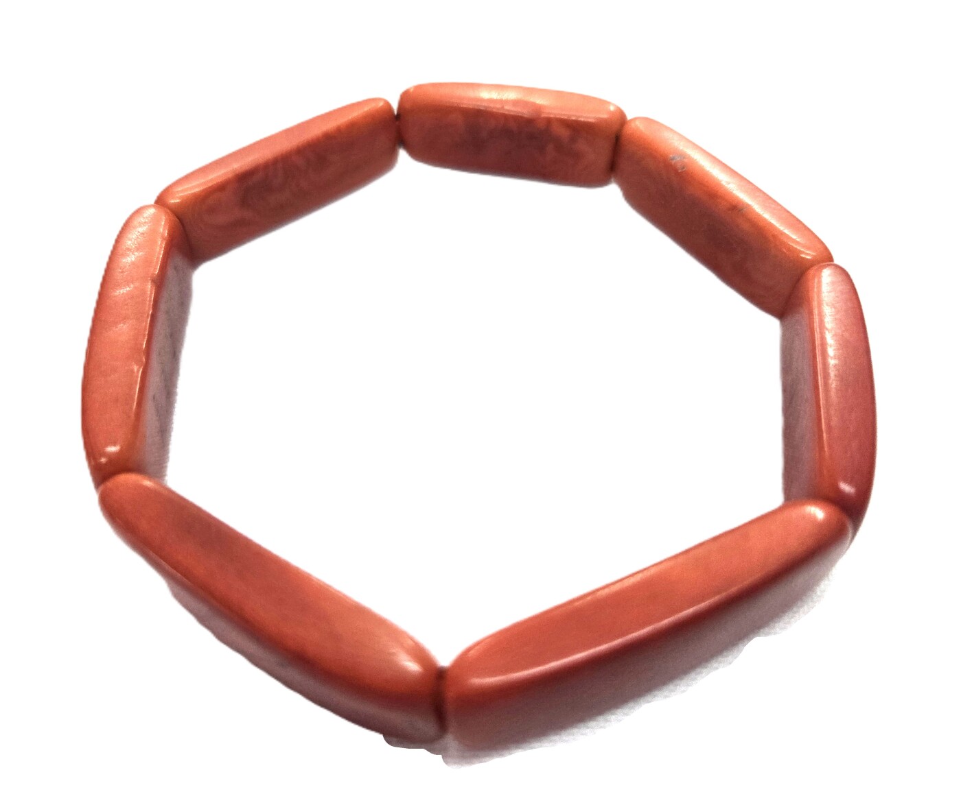 Sunset Orange Link showcases bold orange rectangular tagua pieces arranged horizontally for a clean and dynamic look. Handmade in Ecuador, this bracelet blends vibrant color with contemporary design.